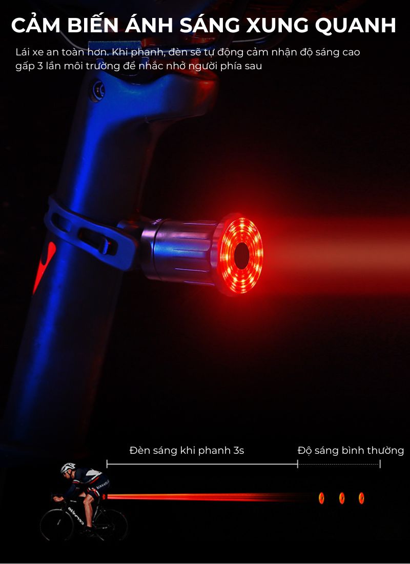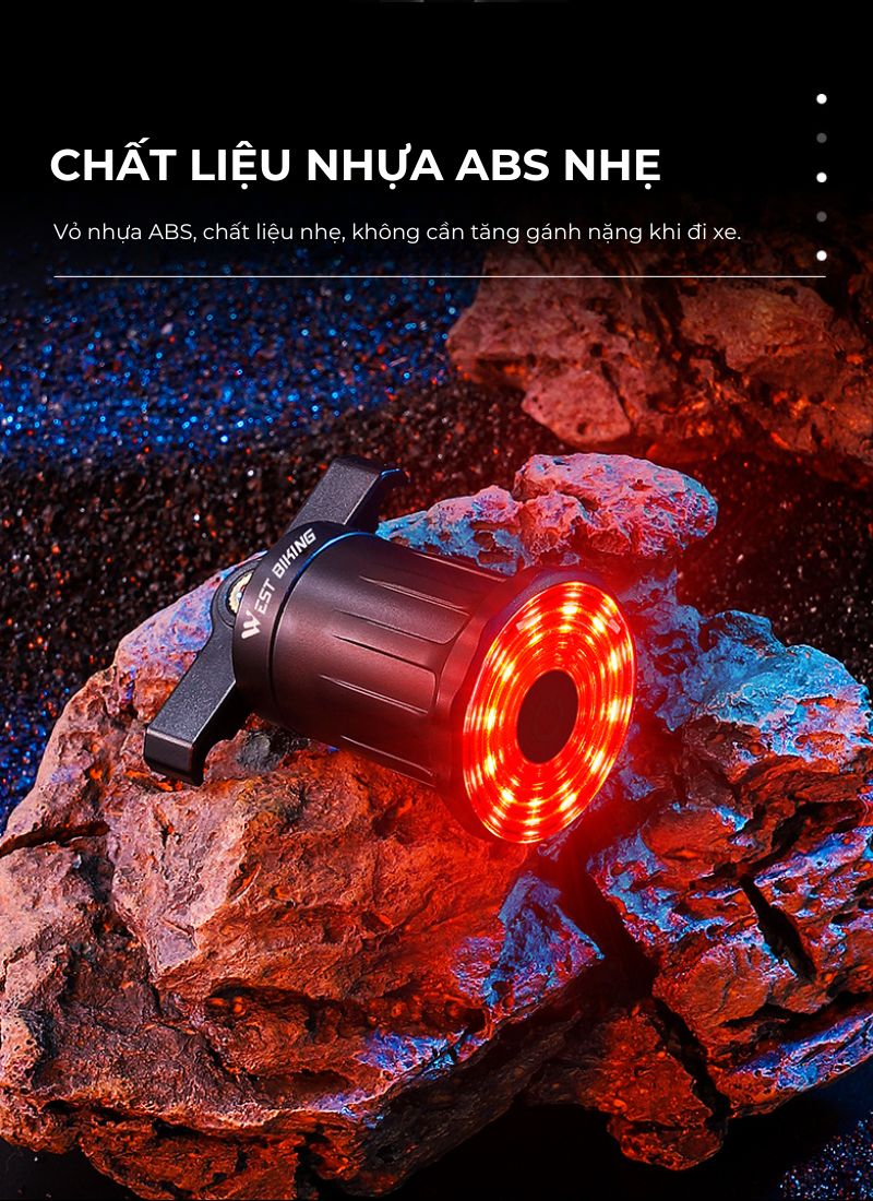 Đèn hậu pin sạc gắn yên xe đạp cảm biến chuyển động WEST BIKING là một phụ kiện thông minh, giúp tăng cường sự an toàn khi đạp xe, đặc biệt là vào ban đêm hoặc trong điều kiện ánh sáng yếu. Với cảm biến ánh sáng xung quanh, đèn tự động điều chỉnh độ sáng cao gấp 3 lần môi trường xung quanh khi phanh, giúp người lái xe phía sau nhận biết nhanh chóng và giữ khoảng cách an toàn. Được trang bị 12 hạt đèn LED mạnh mẽ, đèn cung cấp ánh sáng rõ ràng và nổi bật, trong khi chất liệu nhựa ABS nhẹ giúp giảm gánh nặng cho xe. Đặc biệt, đèn có khả năng chống thấm nước hiệu quả, đảm bảo hoạt động bền bỉ trong mọi điều kiện thời tiết. Cùng với khả năng sạc USB tiện lợi và thời gian sử dụng dài, sản phẩm là sự lựa chọn hoàn hảo cho những người yêu thích đạp xe an toàn và hiệu quả.