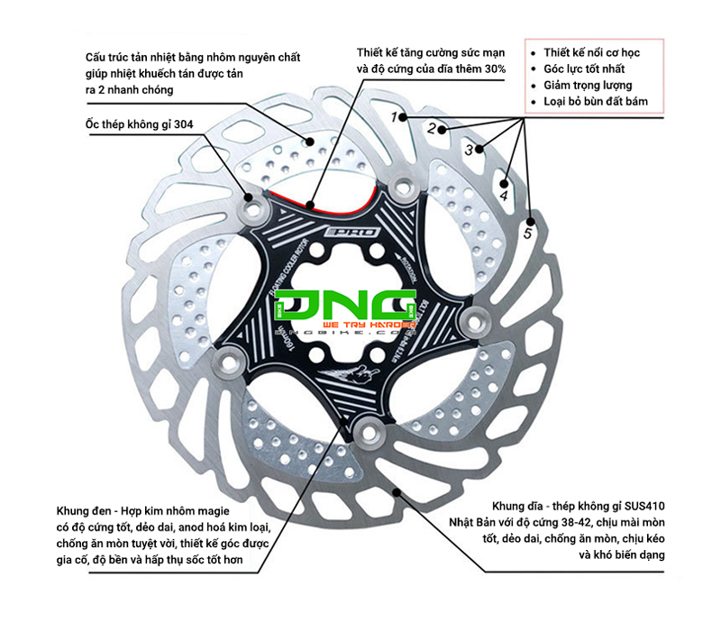 Kích thước đĩa và khoảng cách lỗ bắt ốc trên dĩa. Lưu ý hiện tại DNGBIKE đang cung cấp Đĩa phanh xe đạp tản nhiệt IIIPRO kích thước 160mm