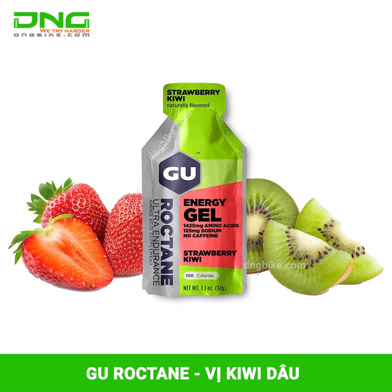 Gel năng lượng Gu Roctane Energy vị dâu Kiwi Gói 100 calo giúp đỡ hấp thụ, làm giảm đau dạ dày và duy trì cân bằng nước. Các axit amin chuỗi nhánh (leucine, valine, isoleucine) có thể làm giảm mệt mỏi tinh thần và giảm tổn thương cơ bắp.