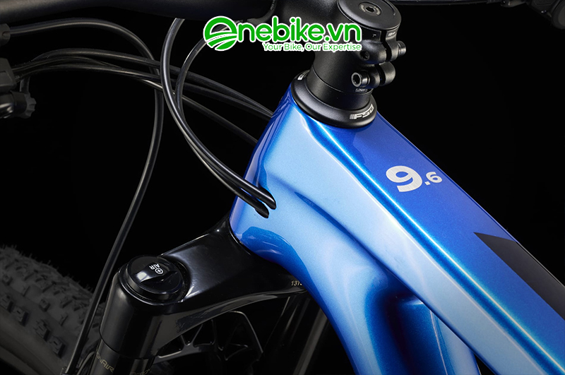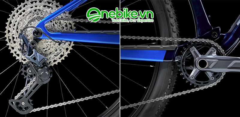 Xe đạp địa hình SUPERCALIBER SL 9.6 Gen 2 trang bị bộ truyền động Shimano được kết hợp giữa Dore và SLX, ghi đông OCLV Carbon và cốt yên Bontrager Line Dropper.