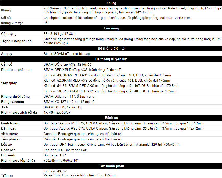 BẢNG THÔNG SỐ XE ĐẠP GRAVEL TREK CHECKPOINT SLR 9 AXS
