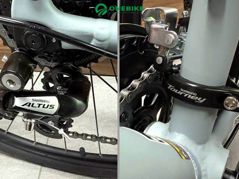 Xe trang bị bộ truyền động Shimano 2×8 tốc độ, với tay đề MPH 2x8S, chuyển đề trước Shimano Tourney và chuyển đề sau Shimano Altus, giúp sang số nhanh, mượt mà và chính xác. Cấu hình này mang lại trải nghiệm đạp xe linh hoạt cả trong đô thị và khi tập luyện thể thao.