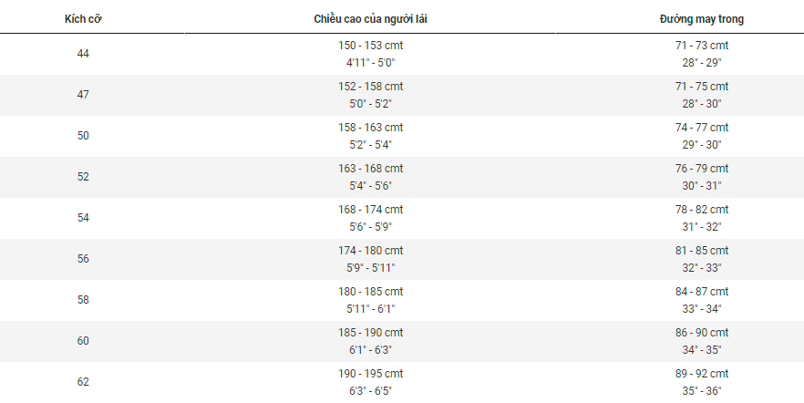 Bảng kích thước khung size