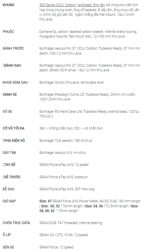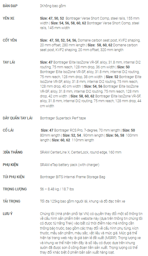 BẢNG THÔNG SỐ XE ĐẠP TREK DOMANE SL 7 AXS GEN4
