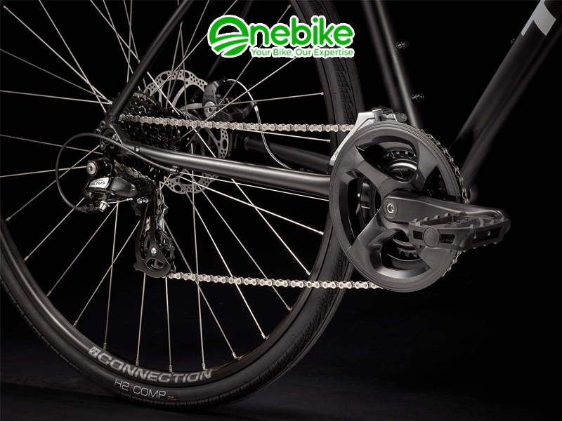 TREK FX1 Disc sử dụng bộ truyền động Shimano của Nhật: tay đề Shimano EF500, 8-speed, đề trước Shimano Tourney TY710, 34.9 mm clamp, top swing, dual pull, đề sau Shimano Altus M310, giò đạp Forged alloy, ổ líp Shimano HG31, 11-32, 8-speed, sên xe KMC Z8.3