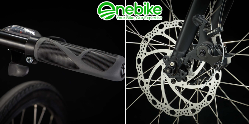 Ngoài ra, Xe đạp sử dụng bao tay nắm Bontrager Satellite, nhiều vân mang lại sự thoái mái khi lái. Hệ thống thắng đĩa cơ Tektro MD-U310, flat mount, 160mm rotor hiệu suất cao, đảm bảo an toàn trong mọi điều kiện thời tiết.
