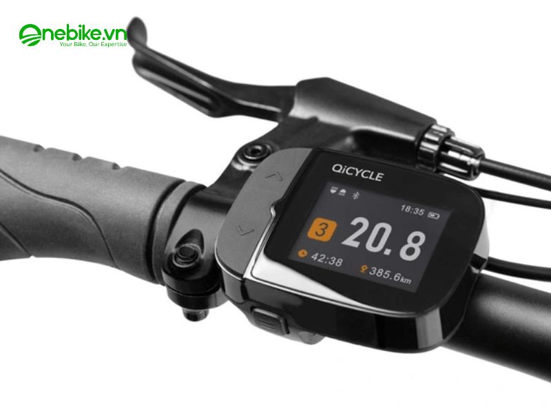 Chiếc Qicycle được trang bị màn hình LCD kích thước lớn hiển thị đầy đủ các thông số như tốc độ, quãng đường, pin còn lại và chế độ lái. Màn hình có cảm biến ánh sáng tự động, điều chỉnh độ sáng phù hợp với điều kiện môi trường. Vào ban ngày, màn hình hiển thị rõ ràng; vào ban đêm, dịu mắt và không gây chói.