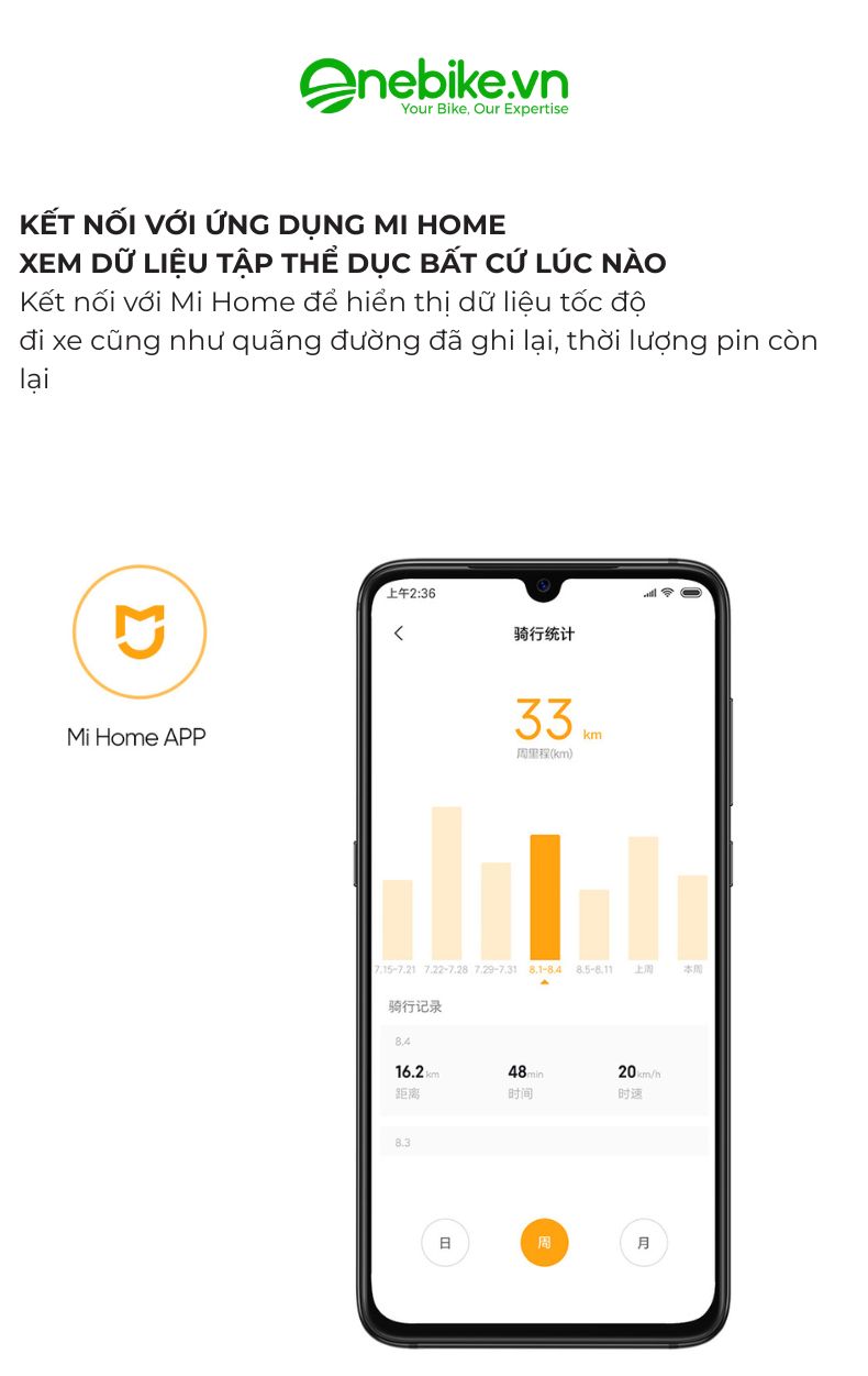 Xe có khả năng kết nối ứng dụng Mi Home, cho phép theo dõi tốc độ, quãng đường, pin còn lại và nhiều thông số khác ngay trên điện thoại.